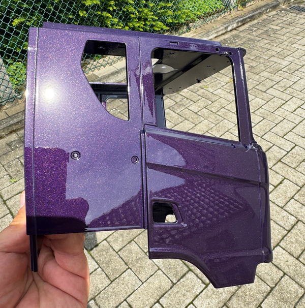 Es geht weiter mit der Hütte. Wie immer, habe ich im Vorfeld alle in Wagenfarbe zu lackierenden Teilen meinem „Hauslackierer“ geliefert. Die Wahl der Farbe benötigte schon eine sehr zeitintensive Suche im Internet. In dem Bronzeton, wie eigentlich vorgesehen, sollte der Lkw auf keinen Fall gestaltet werden. Mir schwebte von Anfang an ein dunkler, aber aussagekräftiger Ton vor, der gut zu dem schwarzen Bullenfänger passt. Die Wahl fiel auf einen Farbton aus dem Hause Audi, nämlich Merlin Purple. Ein Metallic Lila, das unter Sonnenlicht richtig brilliert, unter wenig Licht dann in Richtung Schwarz geht, wie gesagt, „deep purple“ eben. Die lackierten Karosserieteile lagen nun vor. Vor dem Zusammenbau erfolgt aber erstmal das Bestücken der entsprechenden Teile mit LEDs. Auch der „Reklamekasten“, genauso wie die Scheinwerfer in Höhe des Scania-Schriftzuges an der Front, sollten beleuchtet werden. Ansonsten sind alle zur Verfügung stehenden Leuchtenträger für den Einsatz von LEDs vorgesehen.
