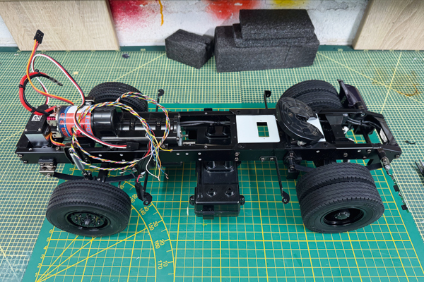 Das Fahrgestell steht auf eigenen Rädern, die Kabel für die hintere Beleuchtung sind verlegt. Die Aufnahme für das Miniservo zur Entriegelung der Sattelplatte ist mit einer PS-Platte vorbereitet