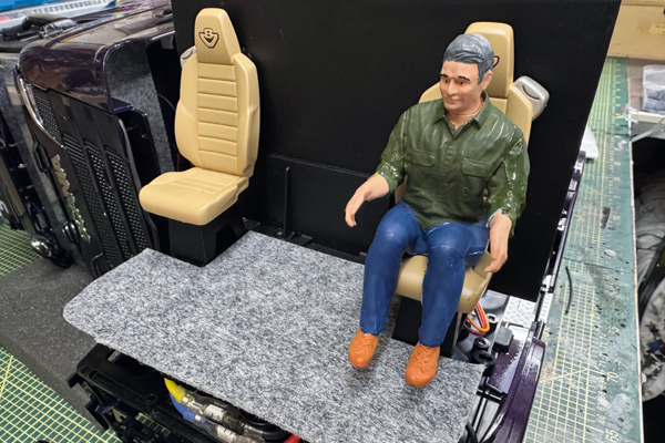 Beim Blick von außen in das Fahrerhaus sollte man möglichst keine Kabel oder sonstige Technik sehen, daher der Einsatz eines Teppichs. Der Fahrer ist angekleidet und wartet auf seinen Einsatz