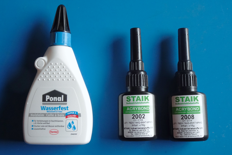 Sehr gut hat sich bei mir in den letzten Jahren hingegen der wasserfeste Weißleim von Ponal bewährt. Denn obwohl er im flüssigen Zustand weiß ist, trocknet er nahezu transparent aus, sodass man zwar sorgfältig arbeiten muss, aber kleine Übermengen trotzdem fast unsichtbar bleiben.