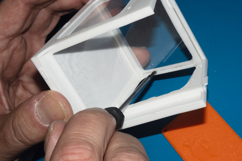 Mit einer kleinen UV-Taschenlampe kann man nach dem Ausrichten der Scheiben den Kleber dann recht schnell, meistens in gut 30 bis 45 Sekunden aushärten lassen, was eine zusätzliche Fixierung der Teile überflüssig macht. Das macht der Kleber zwar bei fast allen Materialien, aber er eignet sich natürlich ganz besonders für die Verklebung mit glasklaren Teilen. Würde man zwei nicht-transparente Kunststoffplatten mit UV-Kleber verkleben, könnte man den Kleber ja nur an den Rändern mit UV-Licht aktivieren und er bliebe an der eigentlichen Klebefläche zwischen den Bauteilen noch sehr, sehr lange flüssig, da er dort ja vor Licht geschützt ist. Das Problem haben wir bei den Scheiben nicht.