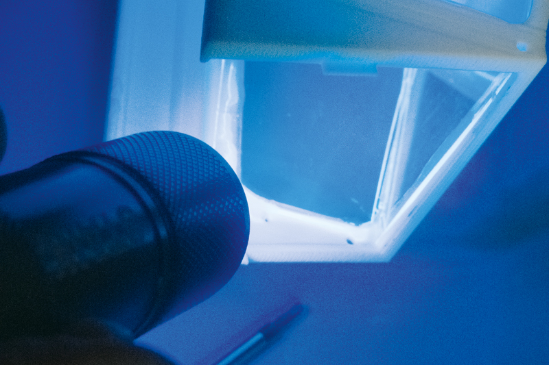 Blaulicht-Alarm! Erst wenn alles passt, wird der Kleber mit dem Licht der UV-Lampe zum Aushärten gebracht